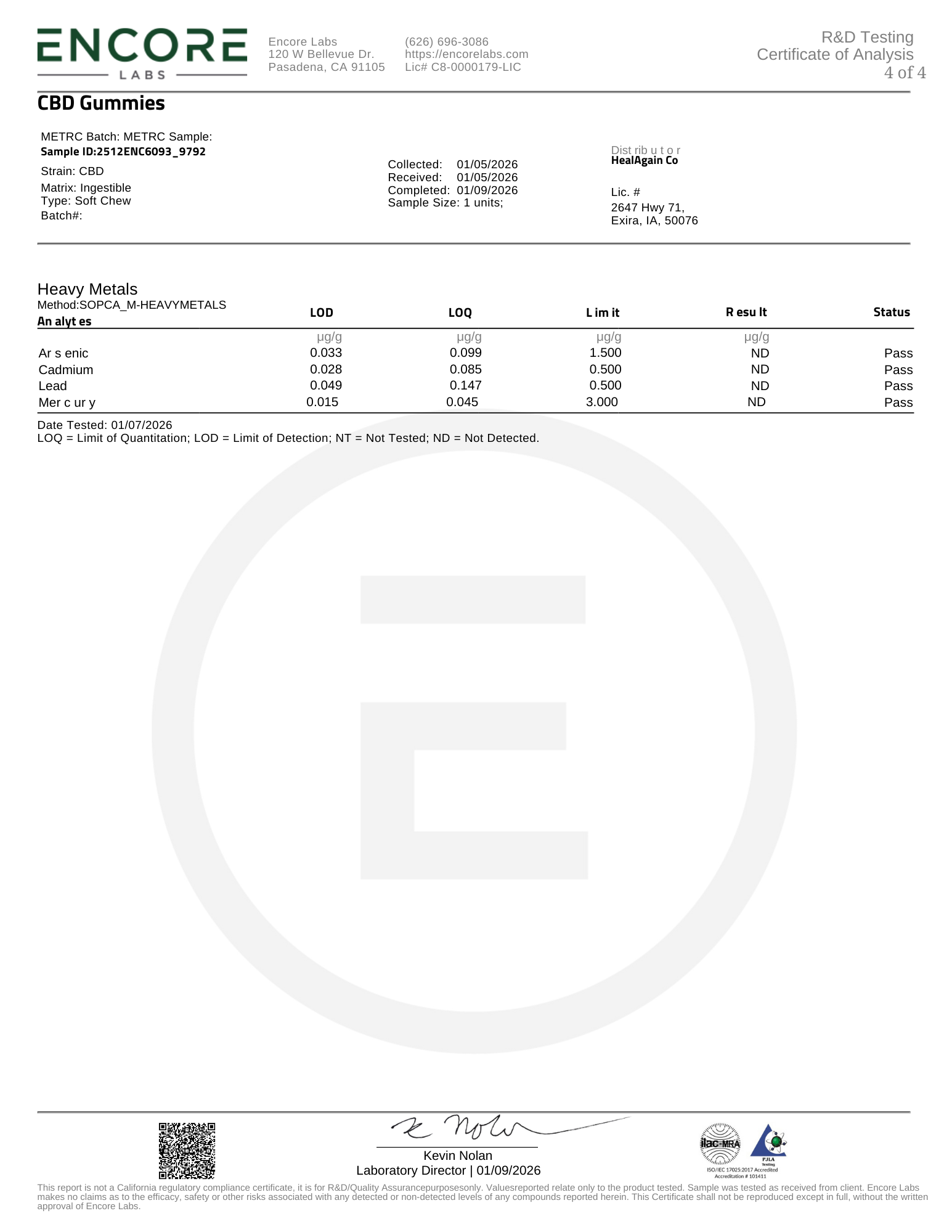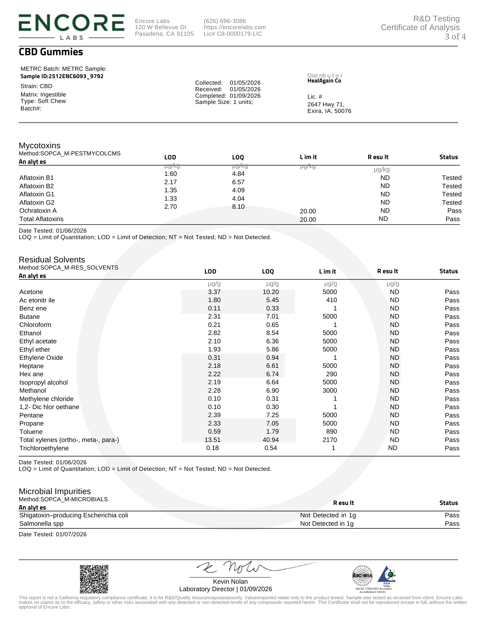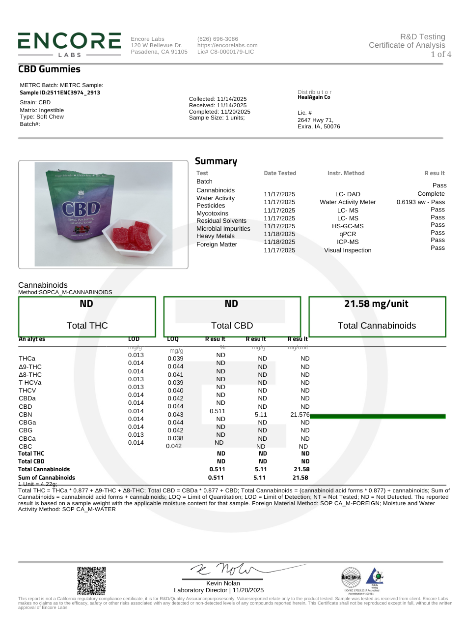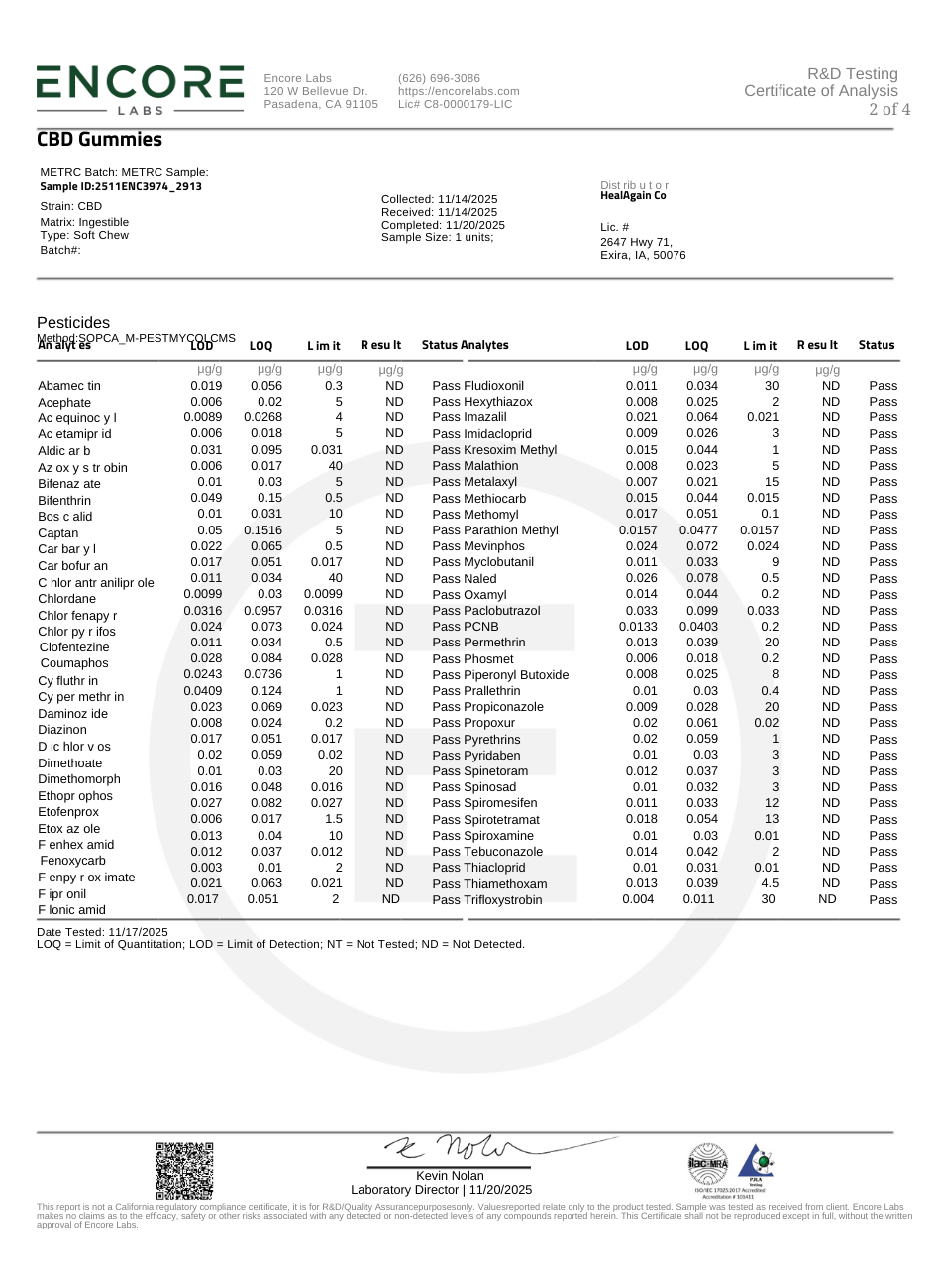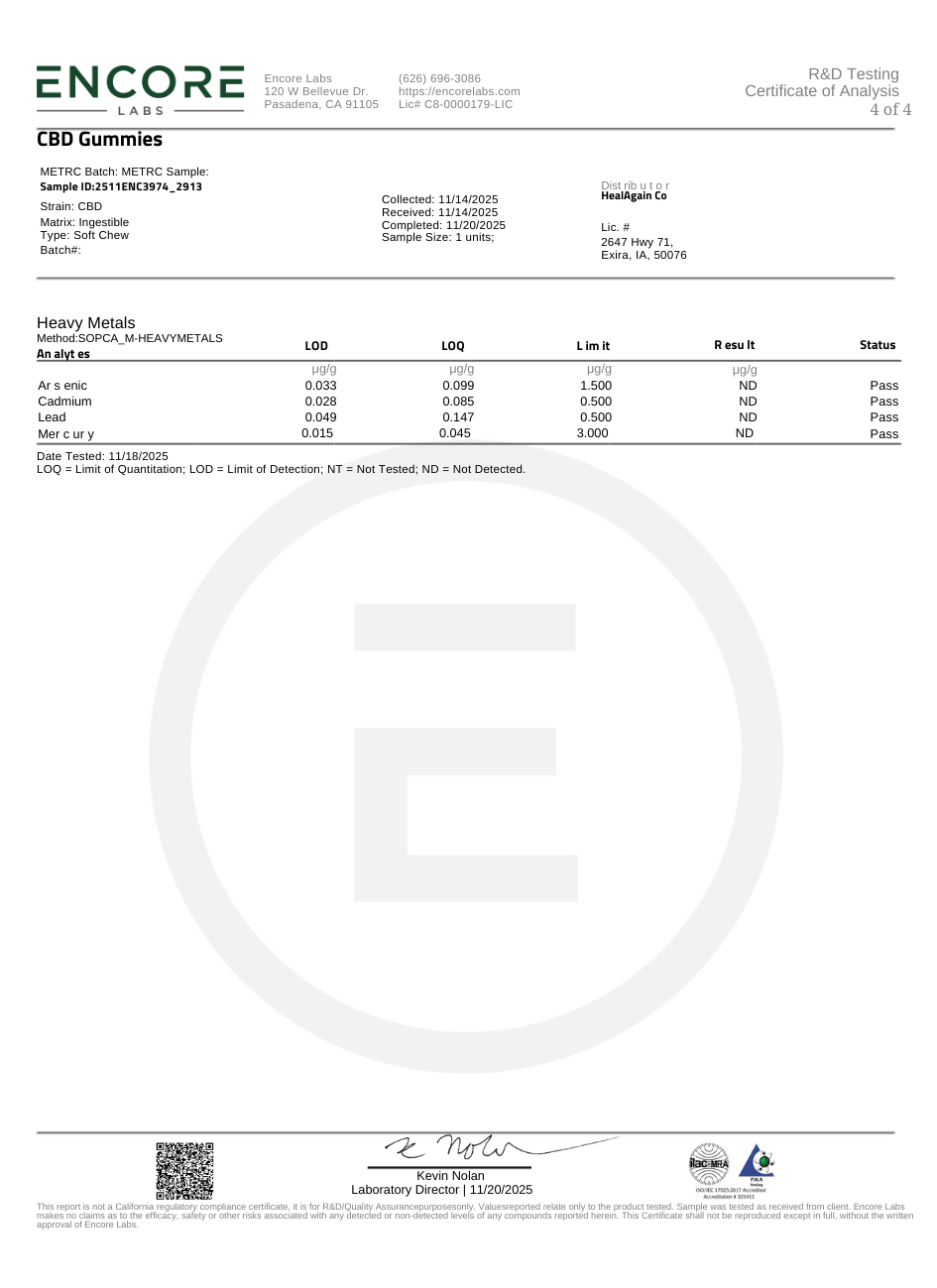 Although we rely on certified labs to provide accurate and precise data, Heal Again Co. cannot guarantee the absolute accuracy of third-party laboratory testing. Variability in lab instrumentation, testing methods, and sample handling can influence reported values. All lab results represent findings from a specific moment in time and may not reflect the precise conditions of a product after storage, shipping, or end use.